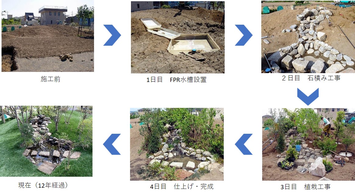 自然石や樹木を使用したビオトープが短期が短期間に施工できます。