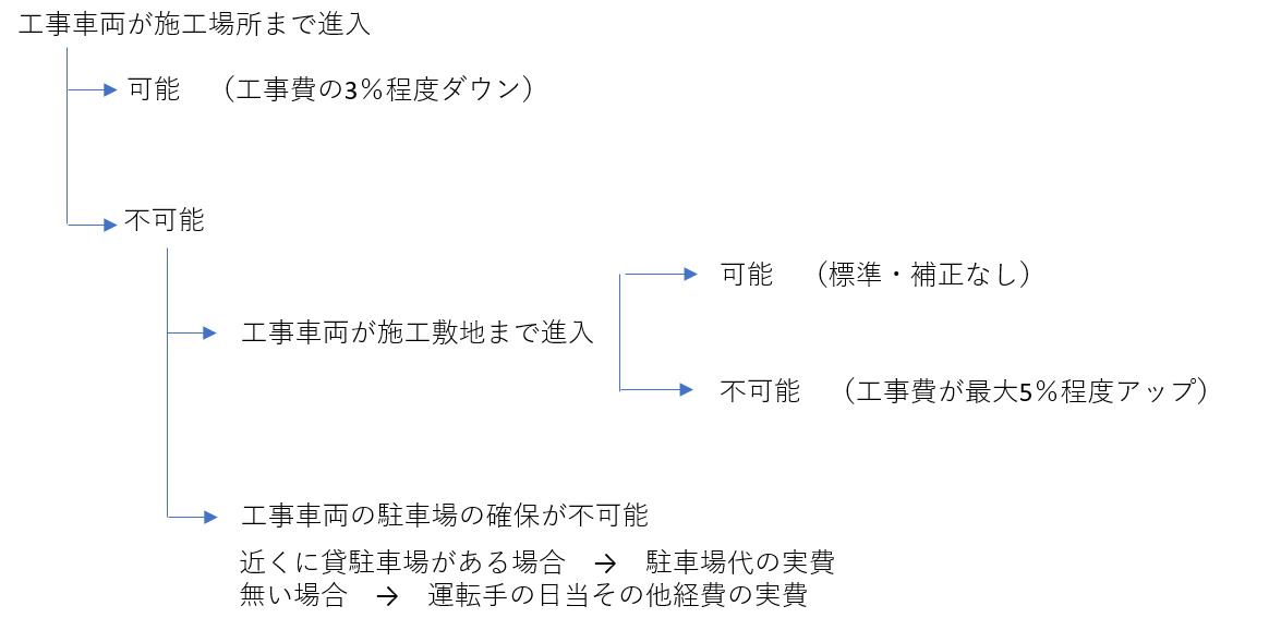 工事場所まで車両(3tユニック)が進入可能な場合は工事費が割安になり車両がまったく近づけない。駐車スペースがない。特殊重機が必要等の場合、工事費は割高になります。